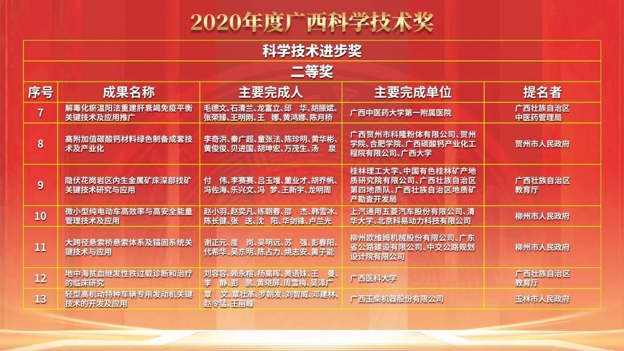 2021年7月30日,廣西科學(xué)技術(shù)獎勵大會(huì )在邕舉行,會(huì )議表彰了2020年度獲得廣西科學(xué)技術(shù)獎、廣西“金繡球友誼獎”的科技人員。
