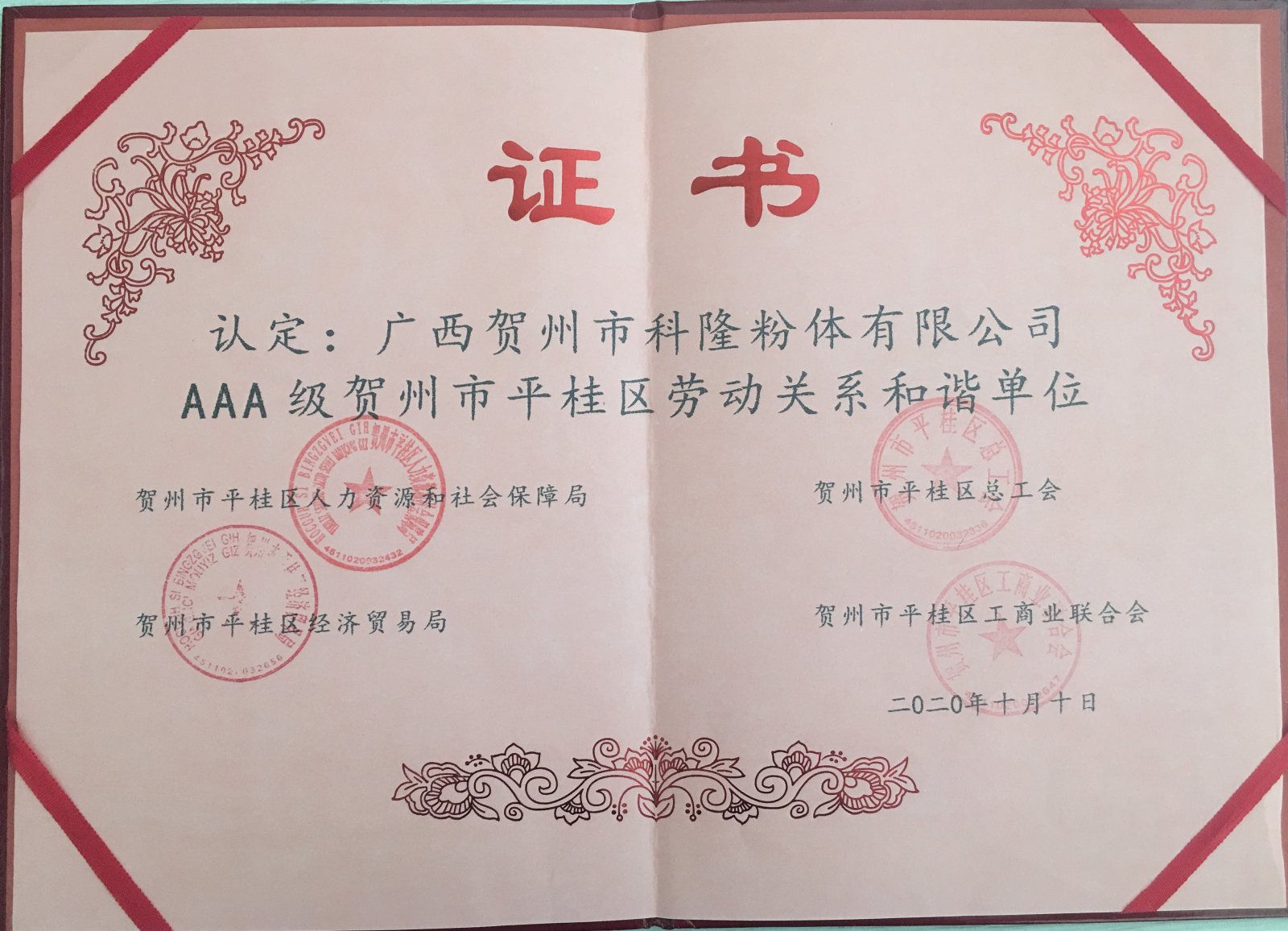 科隆粉體公司榮獲賀州市平桂區“AAA級勞動(dòng)關(guān)系和諧單位”稱(chēng)號